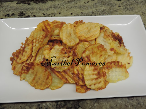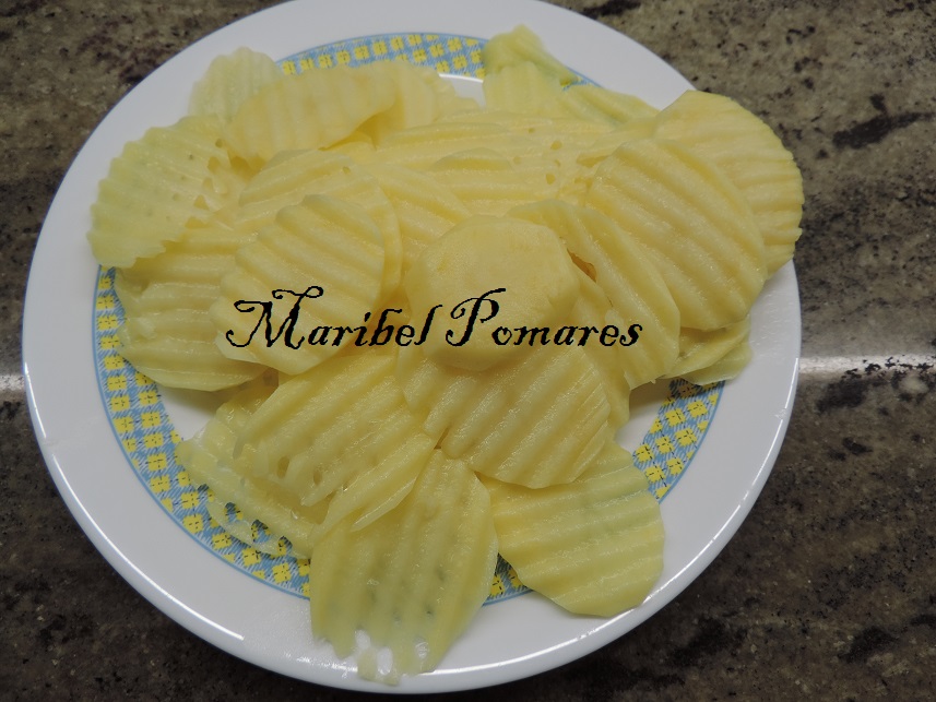 Lavamos, pelamos y cortamos la patatas con la mandolina.