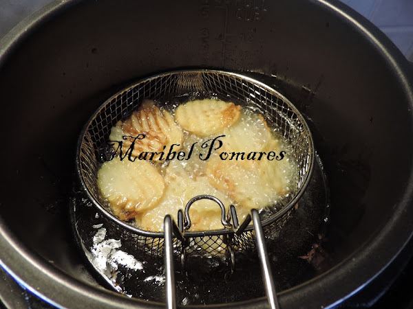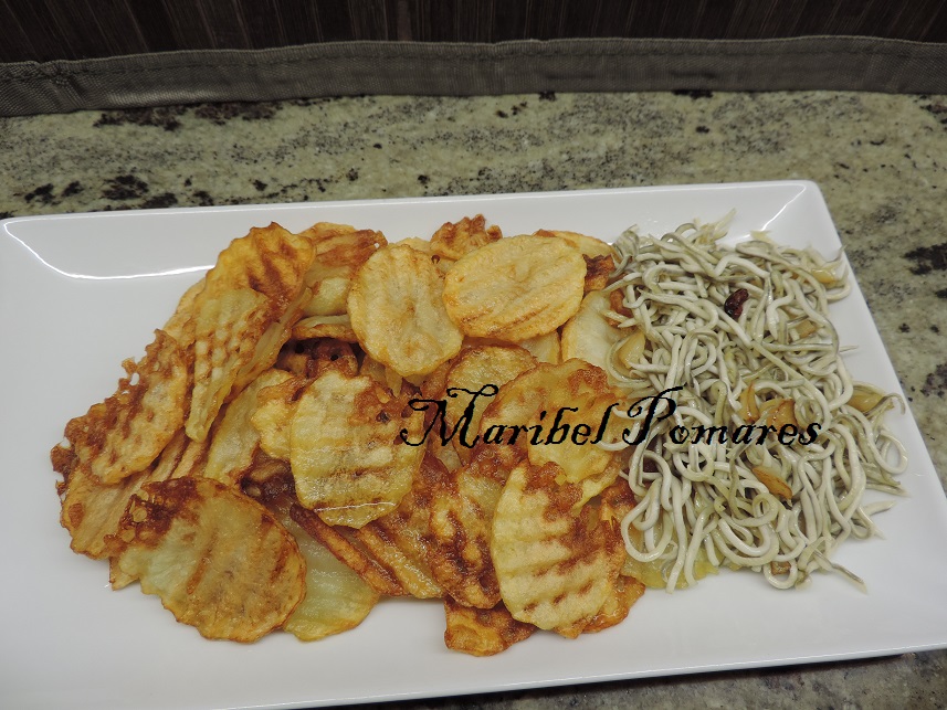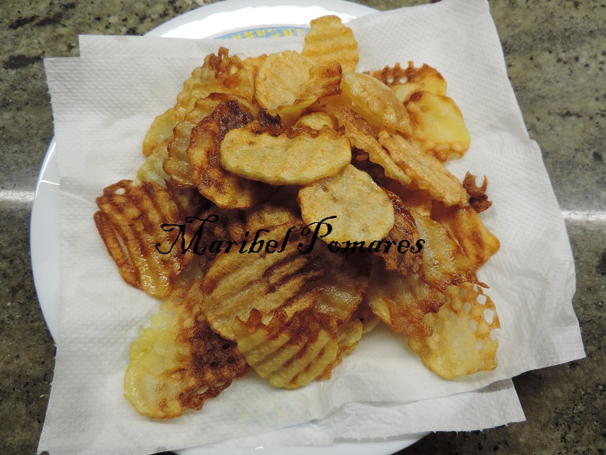 Cuando estén las patatas las sacamos a un plato con papel absorbente para quitarle el aceite sobrante. Normalmente hay que hacerlas menos tostadas, pero a nosotros nos gustan así.