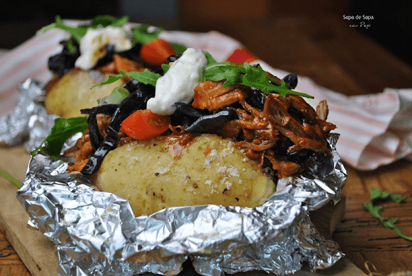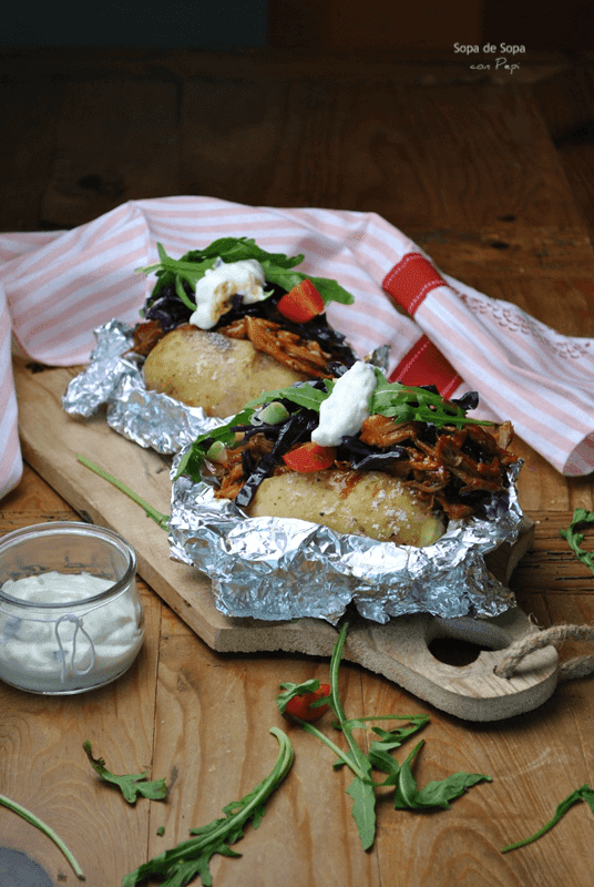 En este caso con algo de tiempo y con pocos ingredientes puedes preparar una deliciosa patata rellena de Pulled Pork, col lombarda, rúcula... que dejarán boquiabiertos a tus comensales.