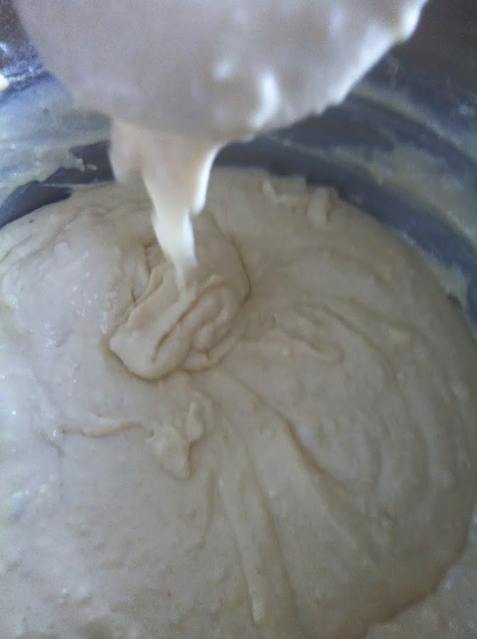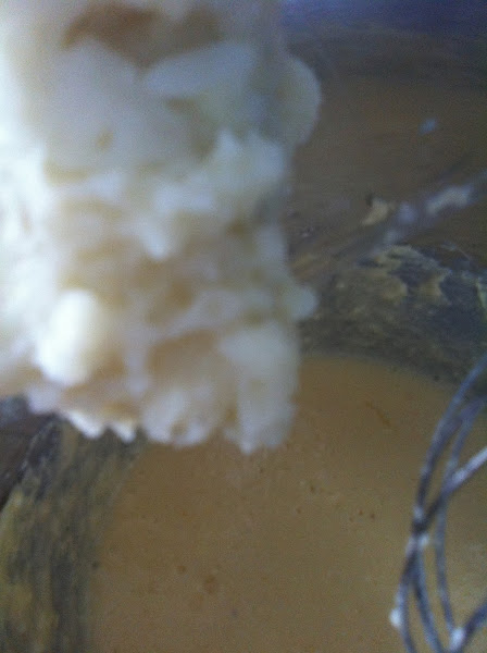 Una vez que los huevos se han ligado con la mantequilla y el azúcar, agregamos el puré de patata...