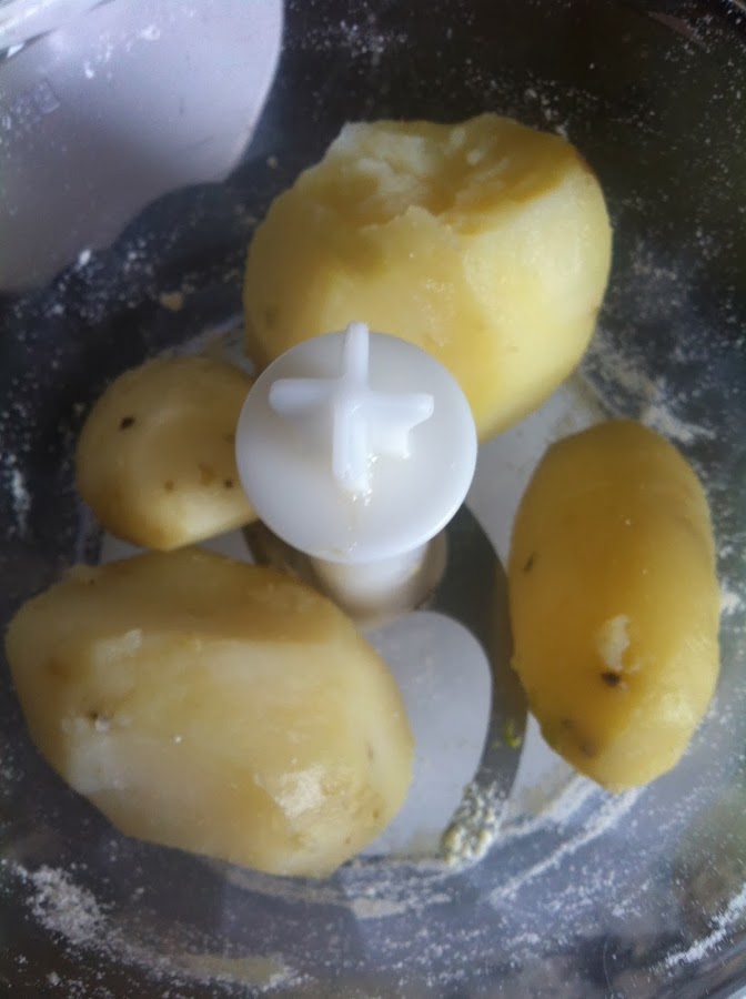 Chocoboss Chocoboss¿Tenemos todos los ingredientes? Bien, pues precalentamos el horno a 180º y preparamos el molde. Trituramos 250 gr de patata, yo he utilizado la picadora no tenía ganas de ponerme con un tenedor ahí dale que te pego, reservamos.