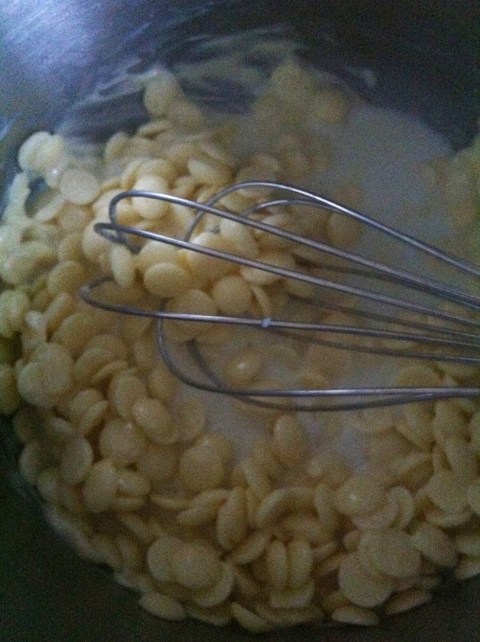 Para la cubierta he optado por preparar un baño de chocolate blanco, pero podéis usar el que más os guste, yo he utilizado