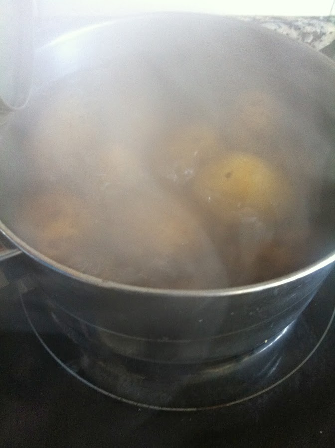 Primero ponemos a cocer las patatas, en casi todas las recetas que he leído, recomiendan usarlas de un día para otro, yo no tenía tiempo así que las cocí por la mañana y las usé de tarde...