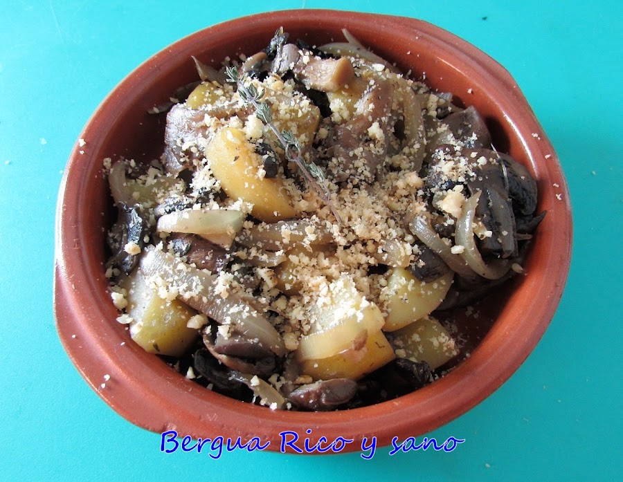 Esta receta, pese a ser sencillísima, es la versión elaborada; los días que voy con prisa, la convierto en un salteado rápido de patatas hervidas y setas con un chorrito de vino blano, sin agua ni cebolla; pero cuando hay tiempo, vale la pena esperar 20 minutitos para probar esta riquísima versión. Para 2 personas: