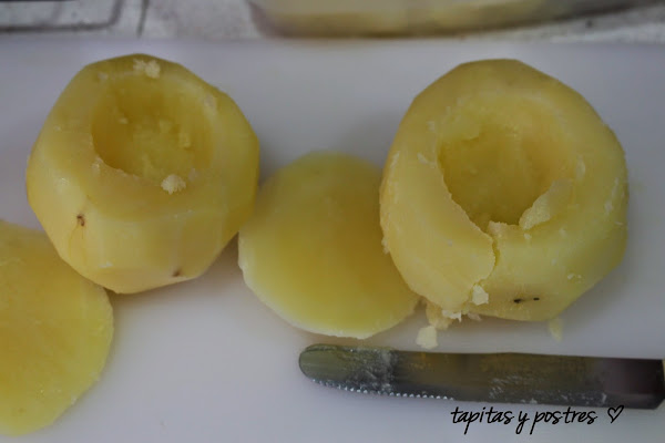 Cuando las patatas estén templadas cortamos una rodaja de arriba y la vaciamos un poco con una cuchara.