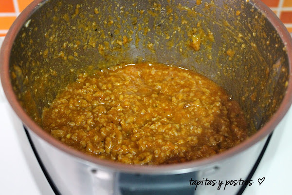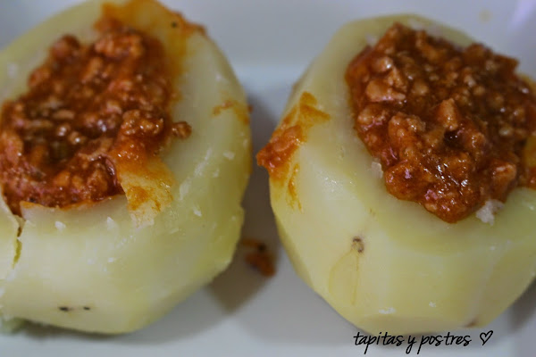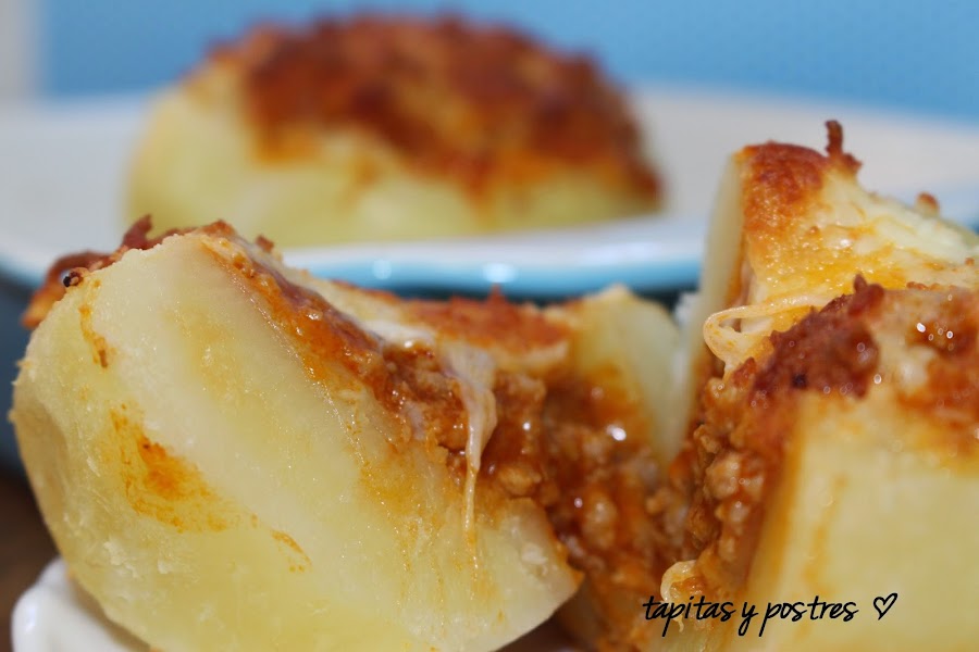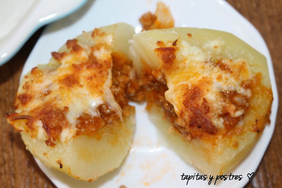 Hoy preparé salsa boloñesa para una lasaña, y de lo que sobró he aprovechado para preparar estas patatas rellenas. La salsa boloñesa es una especie de comodín, lo mismo sirve para una lasaña, que para canelones, empanada... como la preparo con verduras camufladas me sirve como plato único para mis hijos que no son muy verduleros.