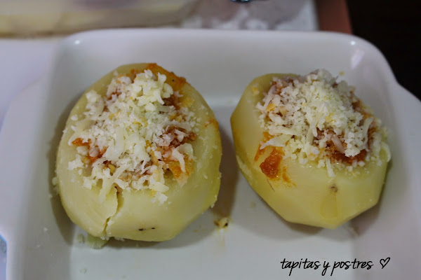 Dejamos que las patatas se enfríen un poco y le cortamos una rodaja de la parte superior. Vaciamos con cuidado el centro y rellenamos con un poco de salsa boloñesa, ponemos queso rallado por encima y gratinamos unos minutos en el horno hasta que se funda el queso.