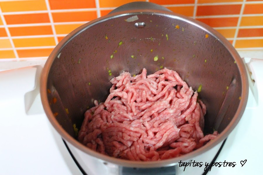 Añadimos la carne y el vino blanco. La rehogamos unos cinco minutos.