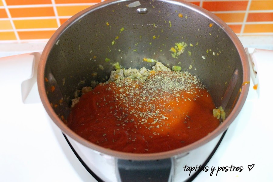 Por último agregamos el tomate, la sal, la pimienta y el orégano. Programamos 30 minutos, temperatura varoma, giro a la izquierda, velocidad cuchara.