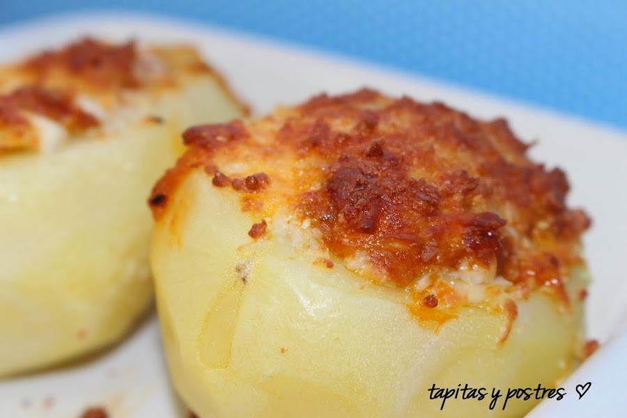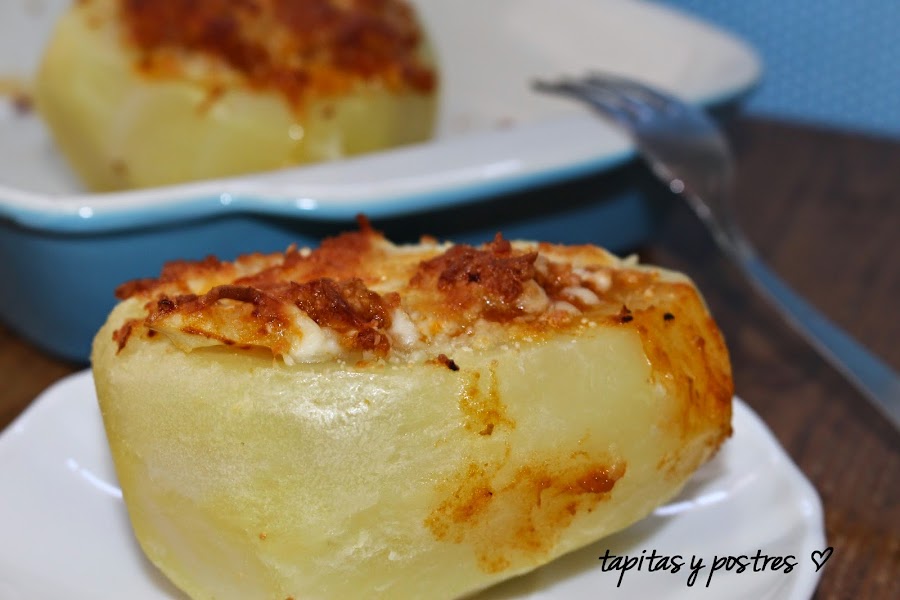 El caso es que me apetecía hacer algo distinto, y he rellenado estas patatas con la boloñesa y las he gratinado un poco.Un plato completo y que se hace todo a la vez.
