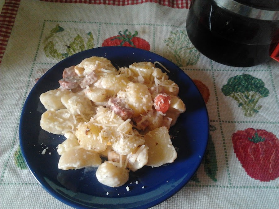 Esta salsa, la solemos usar con pasta, pero como ya habíamos comido macarrones esta semana, decidí probar a hacerla con patatas, por cambiar un poco y mirando por Internet, vi que era algo bastante utilizado.