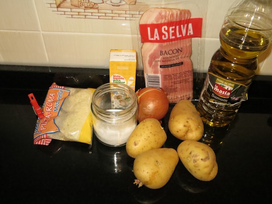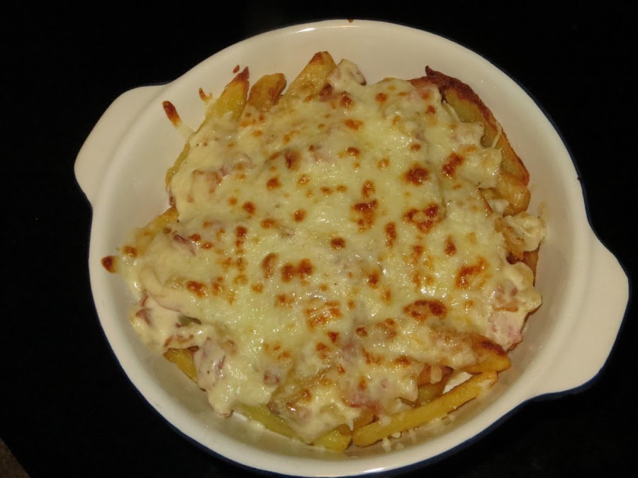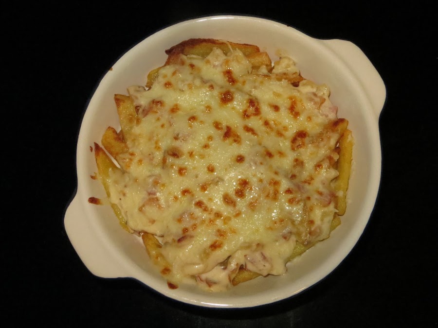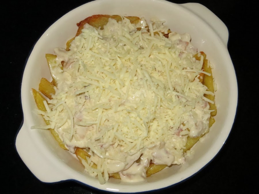 Mientras se van friendo nuestras patatas, vamos haciendo nuestra salsa carbonara. Echamos un poco de aceite en una cacerola y ponemos la cebolla cortada en trocitos pequeños, cuando veamos que comienza a transparentarse añadimos el bacon en tacos o cortado en tiras y cuando se haya cocinado un poco la nata (crema de leche). Salpimentamos y cuando todos los ingredientes se han integrado, la sacamos y la echamos por encima de las patatas. Añadimos queso rallado al gusto.