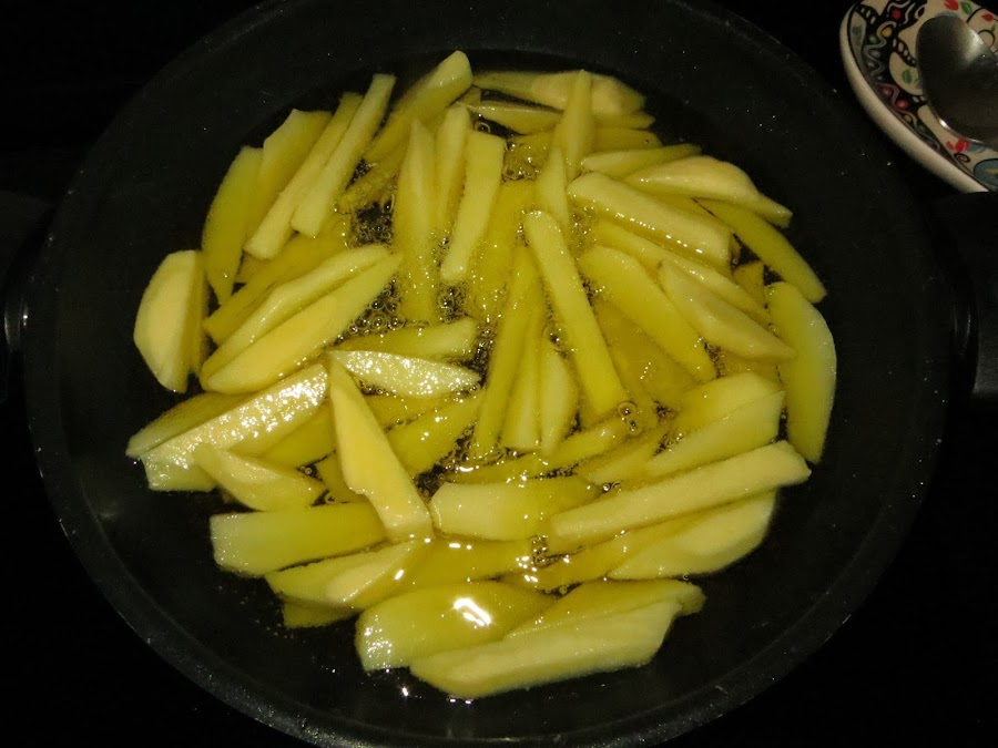 Pelamos y las cortamos como más nos guste, en este caso en bastoncillos, ya que mi peque se las come mejor. Salamos, ponemos aceite en una sartén y cuando estén calientes comenzamos a freírlas, ya sabéis a fuego medio para que se cocinen bien por dentro y justo antes de sacarlas subimos la temperatura para que se doren un poco por fuera. Escurrimos en papel absorbente y las pasamos a una fuente apta para horno.