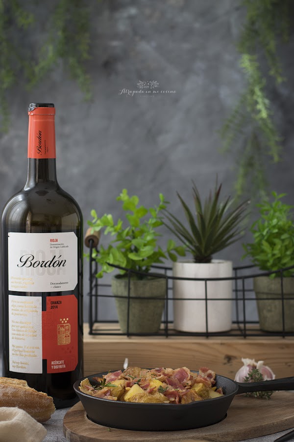 Hemos servido este plato acompañado de un vino tinto Rioja, concretamente el Bordón Crianza de 2014 de Bodegas Franco Españolas en formato Magnum, un coupage de uva Tempranillo y Garnacha tinta con crianza de 14 meses en barrica, que podéis obtener en este formato a un precio aproximado de 15 euros la botella.