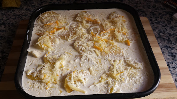 Es importante que las patatas queden totalmente cubiertas con la nata (crema de leche) para que se cocinen bien.