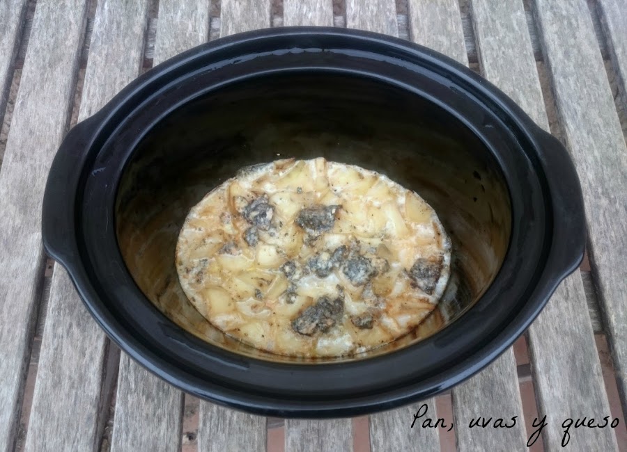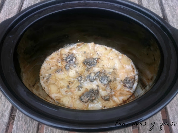 Untamos el fondo y los laterales de la olla con manteca de cerdo. Echamos las patatas en la Crock-Pot y echamos la leche. Repartimos unas nueces de mantequilla y el quesodesmenuzado.