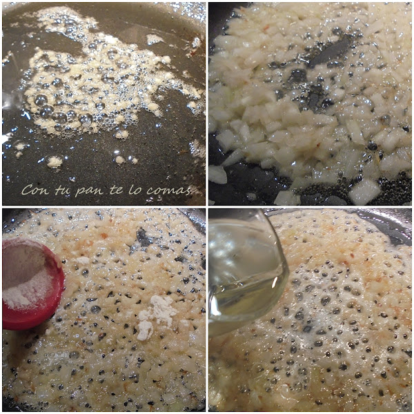 6. Añadir 1 cucharada de harina y el azafrán. Remover con una cuchara y agregar el vino blanco.