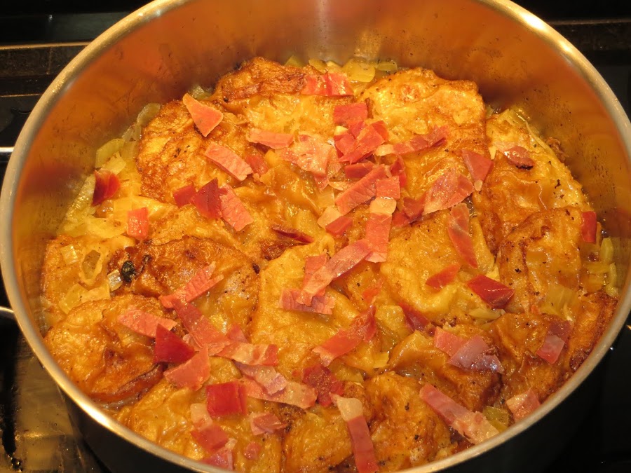 A continuación, añadimos las patatas y el caldo y dejamos cociendo de 20 a 25 minutos, cuando clavemos un cuchillo y veamos que las patatas están blandas es que están listas. Cinco minutos antes de sacarlas les añadimos el jamón y el perejil y ya están listas para comer.