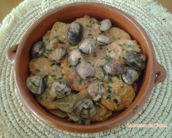 Pelar las patatas, lavarlas, secarlas con papel de cocina y córtalas en rodajas finas para que se hagan por igual. Salpimentarlas. Batir los huevos en un cuenco y poner harina en otro. Pasar las rodajas de patatas por harina y huevo y freírlas en una sartén con abundante aceite hasta que se dore el rebozado. Dejarlas escurrir sobre papel de cocina. Poner las patatas en una fuente de horno y cubrirlas con el caldo que has preparado. Meter al horno durante 20 minutos o hasta que estén blandas. Lavar las almejas, que las hemos tenido en agua con sal un buen rato. Sacar la fuente del horno, repartir por encima las almejas, tapar con papel de aluminio y meter de nuevo al horno durante 3 minutos. Sacar del horno y servir caliente.
