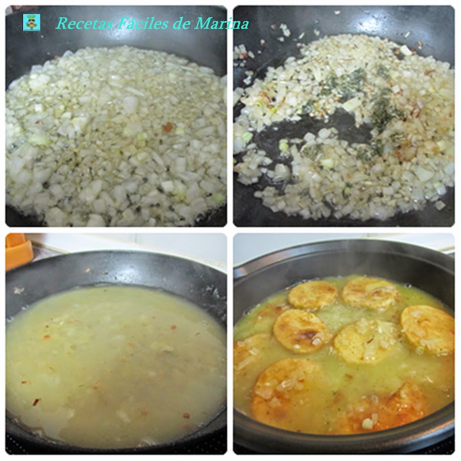 4. En el aceite que hemos frito las patatas (dejando solo un poco, ya que sería excesivo) echamos la cebolla, cuando está pochada se añade lo que hemos machacado en el mortero y una cuchara de harina, para que expese la salsa, mezclar muy bien y por último añadir el caldo y el azafran. Cuando hierva se vierte sobre las patatas y ya se deja cocer unos 20 minutos.