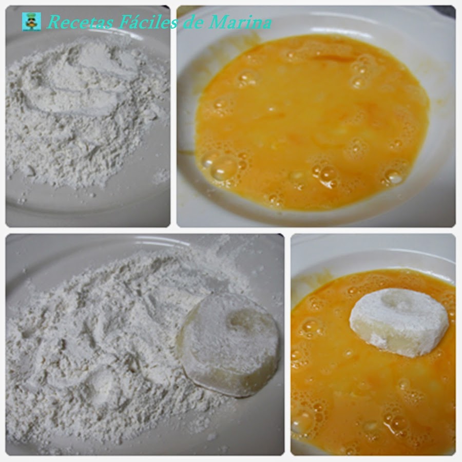 2. Una vez hecho lo anterior preparamos dos platos uno con harina y otro con el huevo batido, y vamos pasando todas las rodajas de patatas primero por la harina (sacudimos) y despues por el huevo.