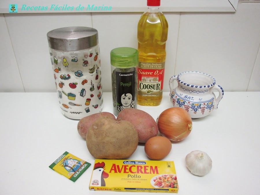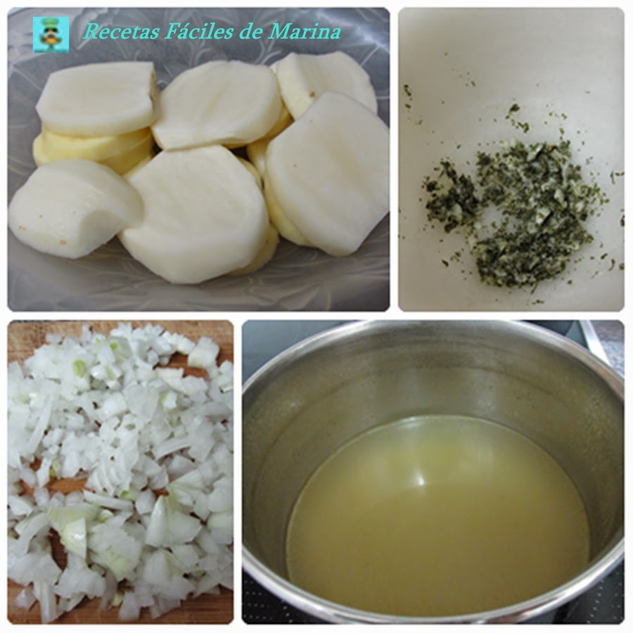 1. En primer lugar se preparan los ingredientes, se pelan las patatas y se cortan en rodajas de 1 cm de grosor. En un mortero se machaca el ajo, con perejil y un poquito de sal. Se corta la cebolla en trocitos pequeños y por último en un cazo se pone a hervir medio litro de agua con una pastilla de caldo de pollo, para hacer el caldo. Si se compra en brit ya hecho o se hace casero mucho mejor.