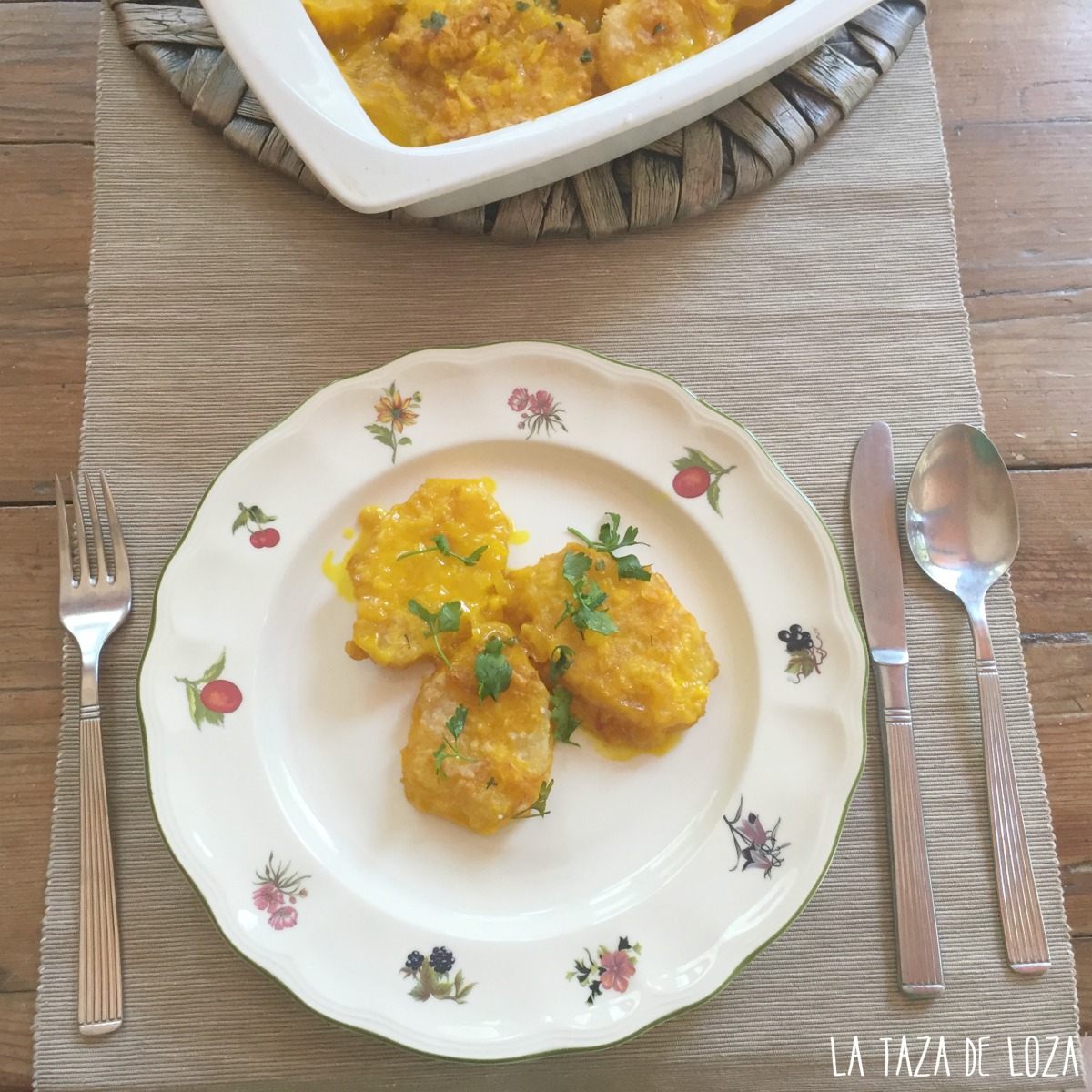 Añadir el vino, dejar que evapore el alcohol y ponemos el azafrán molido y la pizca de pimienta. Echar esta salsa encima de las patatas y añadir en la fuente donde las vayamos a hornear con un poco de caldo o agua, yo le pongo mineral pues el agua de la zona donde vivo tiene mucha cal.