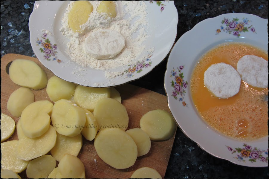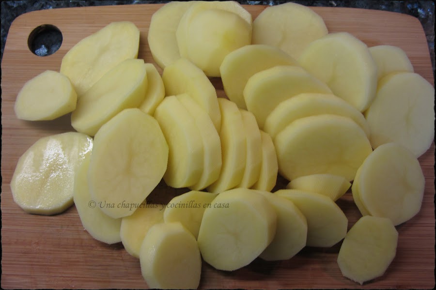 Pelar, lavar y cortar las patatas en rodajas de 1 centímetro aproximadamente.