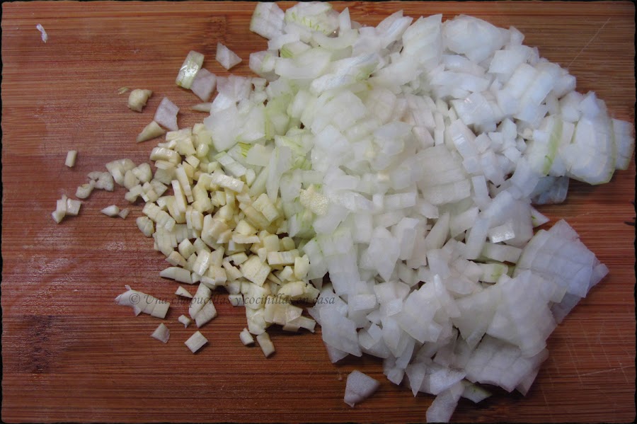 Picar la cebolla en brunoise y los dos dientes de ajo bien picaditos.