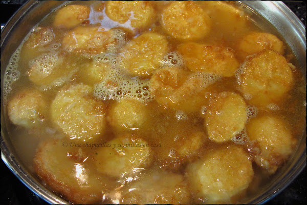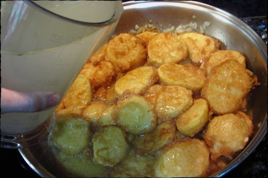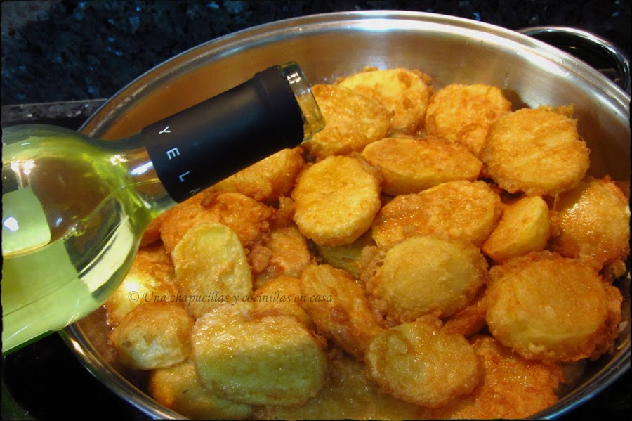Cuando este hecha, disponemos encima las patatas y agregamos un chorrito de vino blanco(opcional). Dejar rehogar un poco.