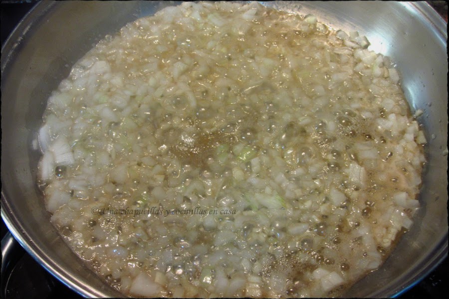 Saltearlo todo en un poco del aceite que hemos usado para freír las patatas, echando primero el ajo y cuando empiece a dorar un poco, agregarle la cebolla.