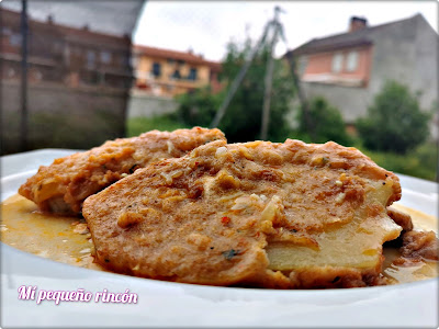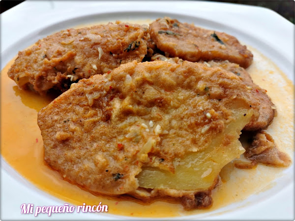 Preparamos un plato con abundante harina y en otro batimos los huevos, ahora una sarten con aceite al fuego y vamos pasando nuestras rodajas de patata en harina y huevo y las freímos, al retirar cuando estén doradas las iremos colocando sobre una cazuela tipo paella pero con algo de fondo, repetiremos hasta tener todas las patatas fritas y reservaremos.