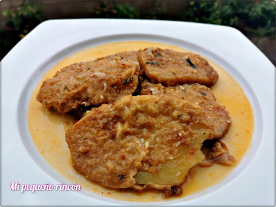 Una vez listo nuestro sofrito añadiremos el vino blanco y una copa de agua y dejamos 15 minutos cocinando, ahora batimos todo muy bien y sin quitar del fuego añadimos otra copa de agua y el azafrán y dejamos cocinar otros 15 minutos, una vez pasado el tiempo añadimos la salsa resultante a las patatas y salpimentamos para darle sabor , dejaremos cocinar todo junto unos 25 minutos para que la salsa se espese, si nos gusta algo mas espeso añadimos un poquito de harina de maíz en un vaso con algo de liquido de la salsa y disolvemos muy bien y lo incorporamos a las patatas dejando unos minutos mas.