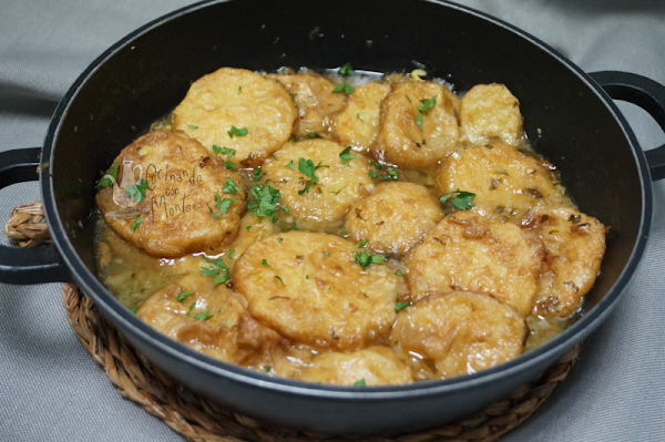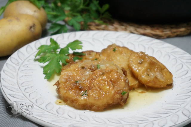 Un plato sencillo que se prepara en dos partes, la primera se rebozan las patatas y la segunda se cocinan con la salsa. Queda un guiso de patatas riquísimo, quedan tiernas y jugosas. El ajo, azafrán y perejil le da un toque muy bueno.