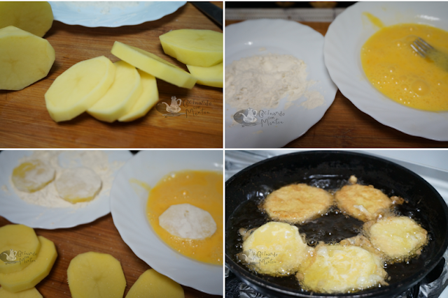Rebozamos las patatas. Ponemos una sartén con abundante aceite a calentar. Pasamos las patatas primero por la harina y luego por el huevo, las vamos echando a la sartén, las dejamos se vayan dorando por los dos lados.