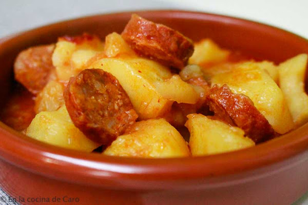 Lo primero que haremos será cascar las patatas, es decir cuando no terminamos de cortarlas con el cuchillo y tiramos. Cuando las cascamos escuchamos como ruido, este proceso sirve par que la patata suelte el almidón natural y espese y de consistencia al guiso. Dejamos en agua fría. Luego picaremos los ajos y el pimiento rojo entreverado ( es un pimiento que es rojo y verde) y sofreímos ambos en una cazuela con aceite de oliva, junto con los chorizos y las dos guindillas.
