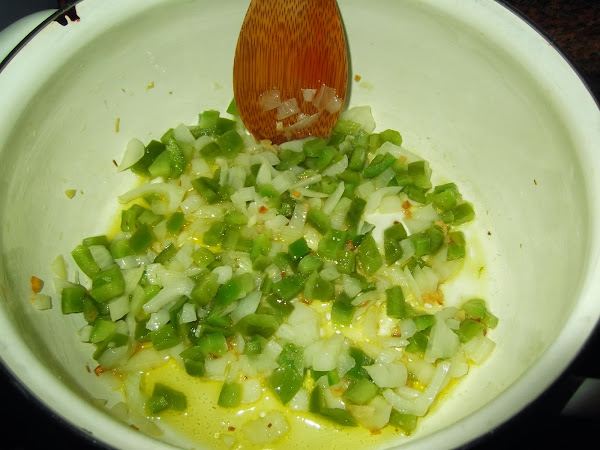 Lo primero que hacemos es echar un chorro generoso de aceite en una cazuela y comenzamos a dorar los ajos que estarán bien picaditos. Mientras tanto cortamos en trozos pequeños el pimiento y la cebolla, salamos, y se los añadimos a la olla hasta que empiecen a dorarse.