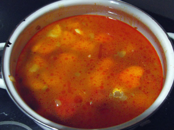 Cubrimos con agua las patatas y les echamos un par de hojas de laurel. Dejamos cocer hasta que las patatas estén blandas, esto dependerá del tamaño que tengan, en mi caso tardaron unos 40 minutos, si vemos que necesita más agua le añadimos más. Cuando probemos las patatas para ver si están blandas, también hacemos lo mismo con el caldo y vemos si necesita más sal.