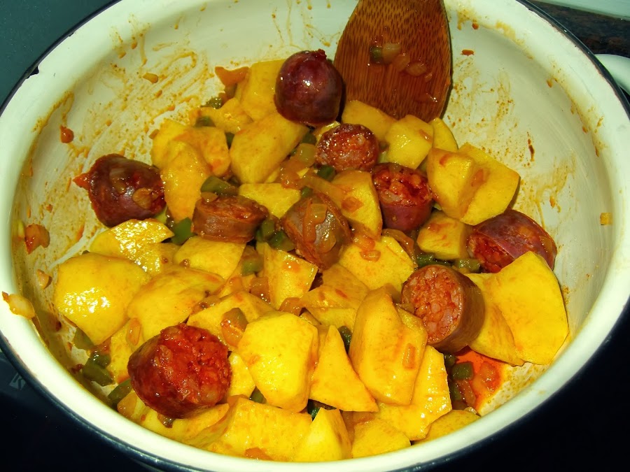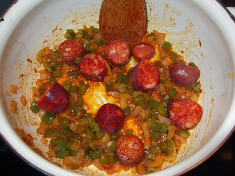 Por otra parte, vamos cortando el chorizo en rodajas, no las hagáis muy finas, ya que si no luego se os puede deshacer mientras cuece. Cuando veamos que la cebolla y el pimiento están listos se añade a la cazuela el chorizo y se sofríe unos minutos. A continuación, retiramos la cazuela del fuego, le añadimos el pimentón y le damos varias vueltas para que se impregnen todos los alimentos.