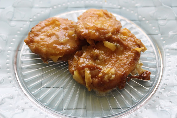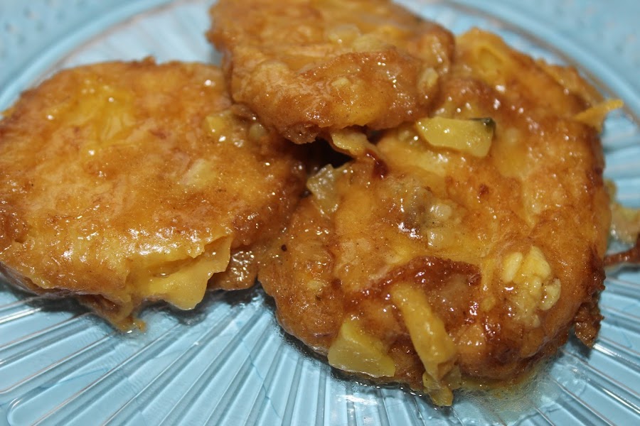Puse dos rodajas juntas, las reboce en harina y huevo batido, las freí y las fui poniendo en una cazuela.