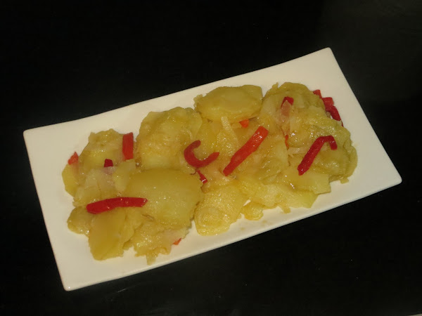 Mientras pelamos las patatas y las cortamos con una mandolina, cuando ha pasado el tiempo sacamos la fuente esparcimos bien las patatas, echamos un buen chorro de aceite, salamos y la volvemos a meter tapada con papel film. La metemos durante cinco minutos, sacamos removemos y las volvemos a meter durante otros cinco minutos, volvemos a remover, les quitamos el papel film y las dejamos otros cuatro minutos y ya están listas para comer.