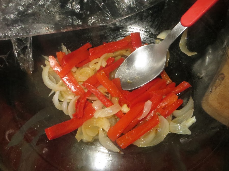 Echamos un chorro de aceite en una fuente apta para microondas, ponemos los dientes de ajo cortados en varios trozos durante 2 minutos a 700 watios. Sacamos y retiramos los ajos, esto era simplemente para dar sabor al aceite, ahora colocamos la cebolla partida en juliana y ponemos durante otros dos minutos, en este caso lo tapamos ya con papel film. Una vez transcurrido el tiempo sacamos y colocamos el pimiento, salamos y metemos durante tres minutos tapados con papel film.