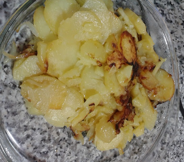 Cuando veamos que la cebolla esta lista con las patatas peladas y en laminas de grosor como para patatas fritas las echamos encima de la cebolla, un poco de sal al gusto y un chorreon de aceite, menú horno 30 minutos y temperatura 1 y vamos viendo hasta que estén a nuestro gusto de blandas.