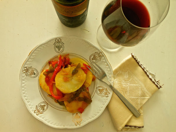 Para finalizar añade las dos cucharadas de vinagre de vino blanco y deja cocinar las patatas y el resto de las hortalizas durante 5 minutos más con la sartén destapada, sacudiendo suavemente la sartén para evitar que las hortalizas se peguen al fondo.