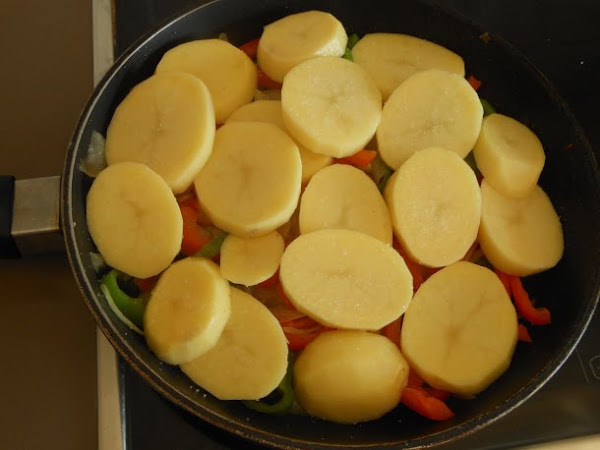 Seguidamente, tapa la sartén con su tapadera y deja que las patatas se hagan a fuego moderado, nº 6 de la placa vitrocerámica junto con el resto de las hortalizas durante 15-20 minutos o hasta que estén tiernas.