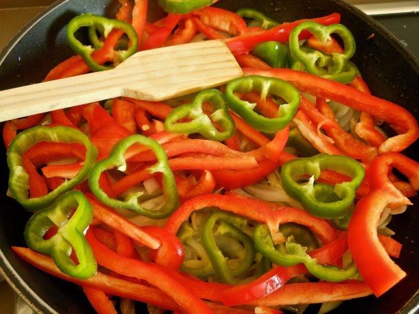 A continuación, añade la cebolla picada y los pimientos troceados. Agrega una poquita de sal fina, remueve con tu cuchara de madera y baja el fuego hasta el nº 4 de la placa vitrocerámica (temperatura media-baja).