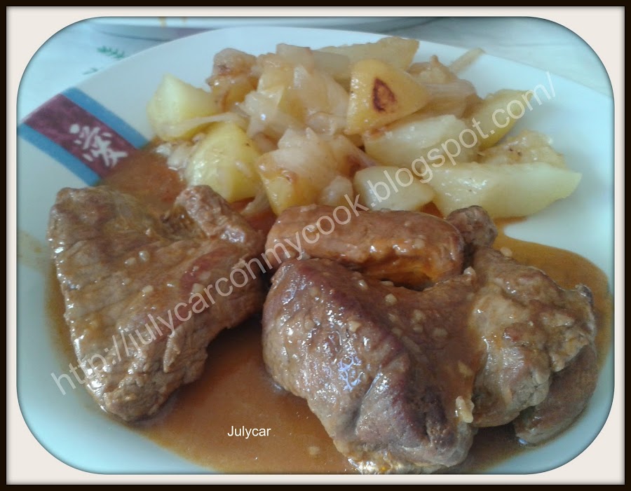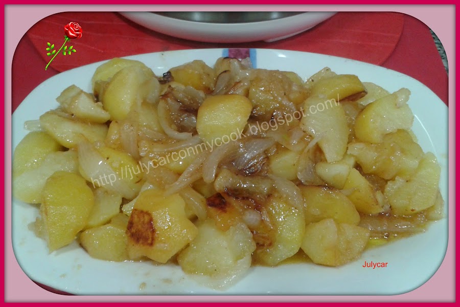 Pelar las patatas y cortar a gajos como para tortilla de patatas, cortar la cebolla tipo juliana mas o menos, añadir todo a la cubeta de la Cocimix Deluxe remover bien, tapar con válvula cerrada, menú arroz, presión III, 5 minutos, despresurizar manualmente y servir acompañando a lo que querais yo a una cinta de lomo al gulasch