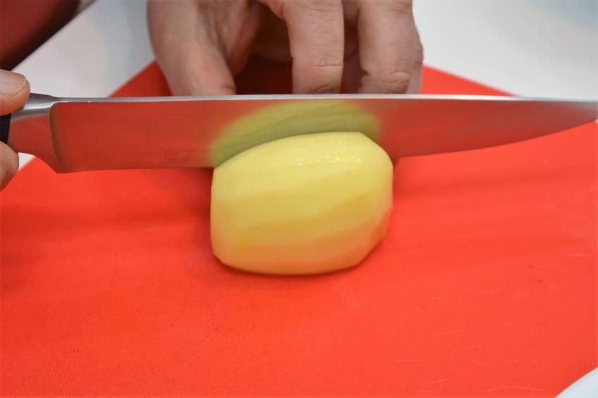 Paso 1 Lo primero que haremos para cocinar estas patatas al ajillo con beicon, es pelar, lavar y cortar en láminas las patatas.