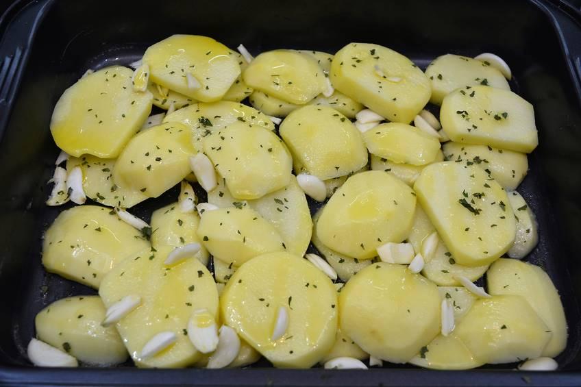 Paso 2 Teniendo las patatas ya cortadas, hacemos lo mismo con los ajos. Ahora disponemos una bandeja para el horno con un poco de aceite de oliva en el fondo. Luego colocamos las rodajas de patata cubriendo todo el fondo, espolvoreamos el ajo por encima, hacemos lo propio con el perejil, ponemos sal y de nuevo un chorrito de aceite de oliva por encima.Paso 3 Calentamos el horno a 180 grados centígrados y cuando esté a esa temperatura, metemos la bandeja al horno durante 25 minutos.