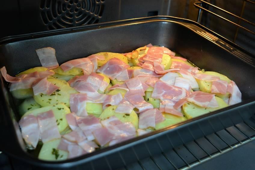 Paso 4 Pasado ese tiempo, sacamos la bandeja del horno y ponemos unos trozos de beicon por encima. Luego devolvemos la bandeja al horno durante 10 minutos más.